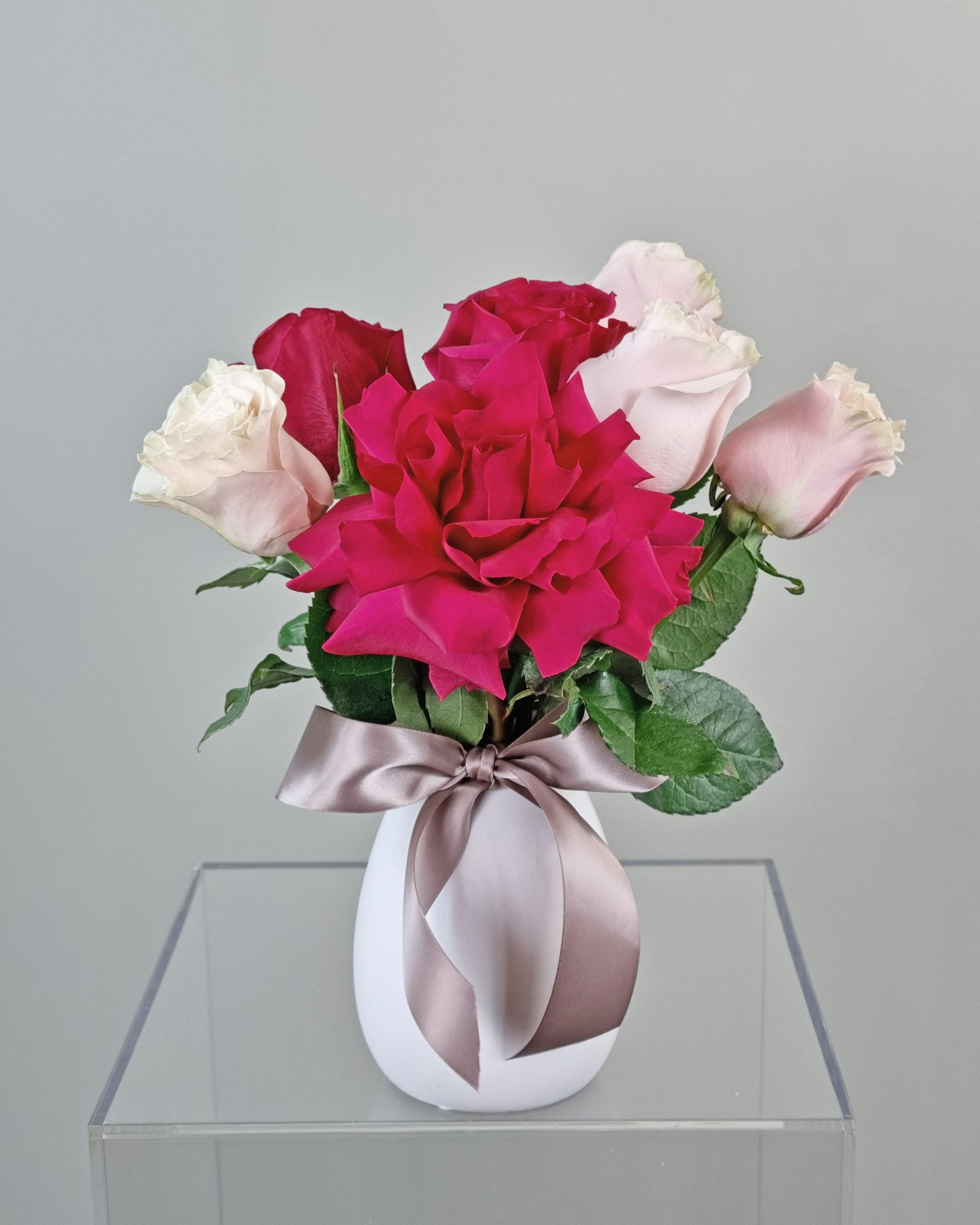 7 roses. Ceramic vase included. H30cm x W25cm